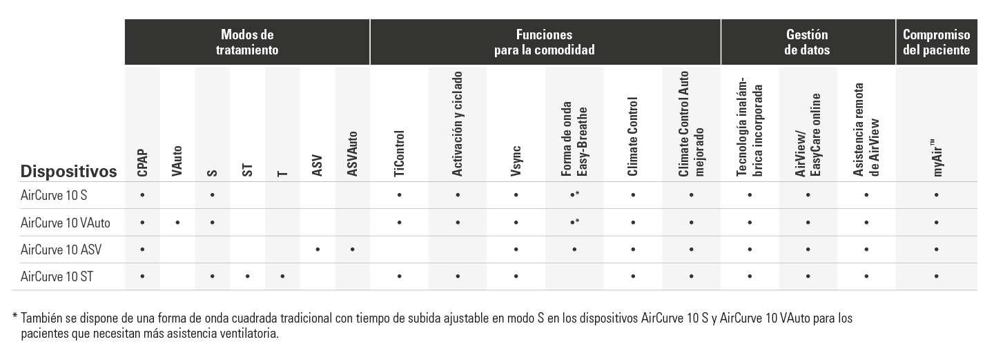 La serie AirCurve 10 incluye los dispositivos AirCurve 10 ASV, AirCurve 10 S, AirCurve 10 ST y AirCurve 10 VAuto. Cada modelo está diseñado para ayudarle a configurar sus pacientes de manera rápida y sencilla, y le ayudará a mejorar la calidad del sueño incluso en los casos más problemáticos.