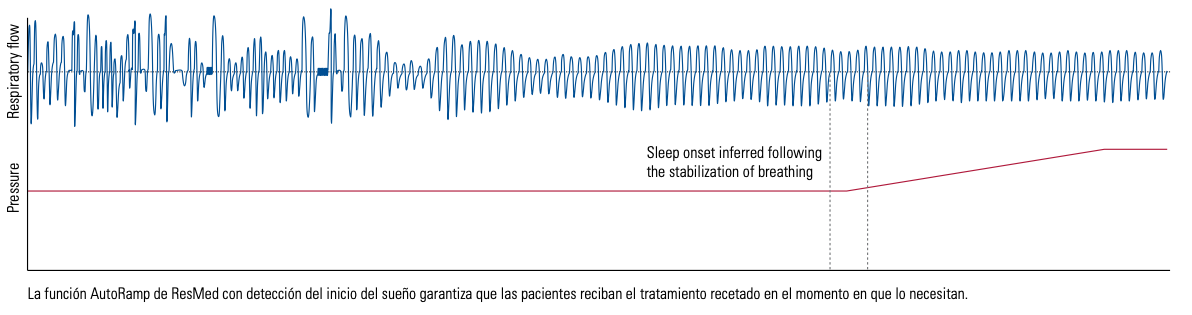 La nueva función AutoRampTM de ResMed con detección del inicio del sueño se ha diseñado para hacer el tratamiento lo más cómodo posible desde el momento en que sus pacientes encienden el dispositivo. El dispositivo suministra una presión baja para que la paciente concilie el sueño con facilidad. Una vez que detecta que está dormida, el dispositivo aumenta de manera confortable la presión para garantizar que se suministre el nivel recetado cuando la paciente lo necesita.