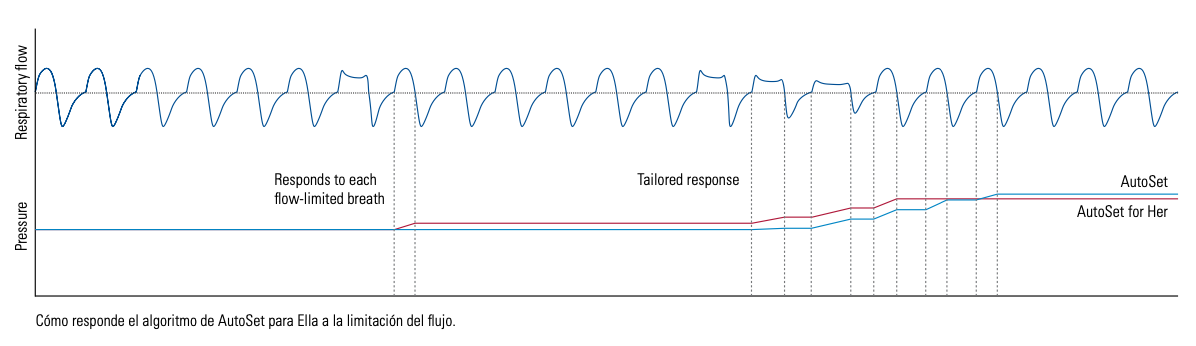 Aunque cerca del 40% de los pacientes con diagnóstico reciente de apnea del sueño son mujeres,4 hasta el momento nunca se había diseñado un tratamiento específicamente para ellas. El dispositivo de tratamiento AirSense 10 AutoSetTM para Ella maneja de forma inteligente las necesidades terapéuticas exclusivas de las mujeres con el primer algoritmo especializado diseñado para tratar la apnea obstructiva del sueño (AOS) leve a moderada en pacientes de sexo femenino. Considerando la alta frecuencia de limitaciones del flujo observada en las mujeres con apnea del sueño,5 AirSense 10 AutoSet para Ella ofrece una solución terapéutica adaptada a sus pacientes mujeres.